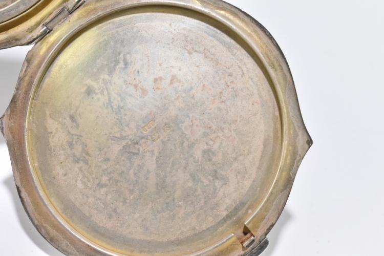 Lot 2374 of 2131: SAUNDERS & SHEPHERD; a hallmarked silver mounted desk timepiece, with Arabic dial, signed Lever, and subsidiary dial, Chester 1915, height 10.5cm not including winding button, with a silver calling card case, a silver compact, and a silver vesta case with portrait aperture, gross weighable silver is 4.5ozt/142g (4).