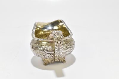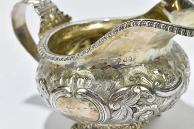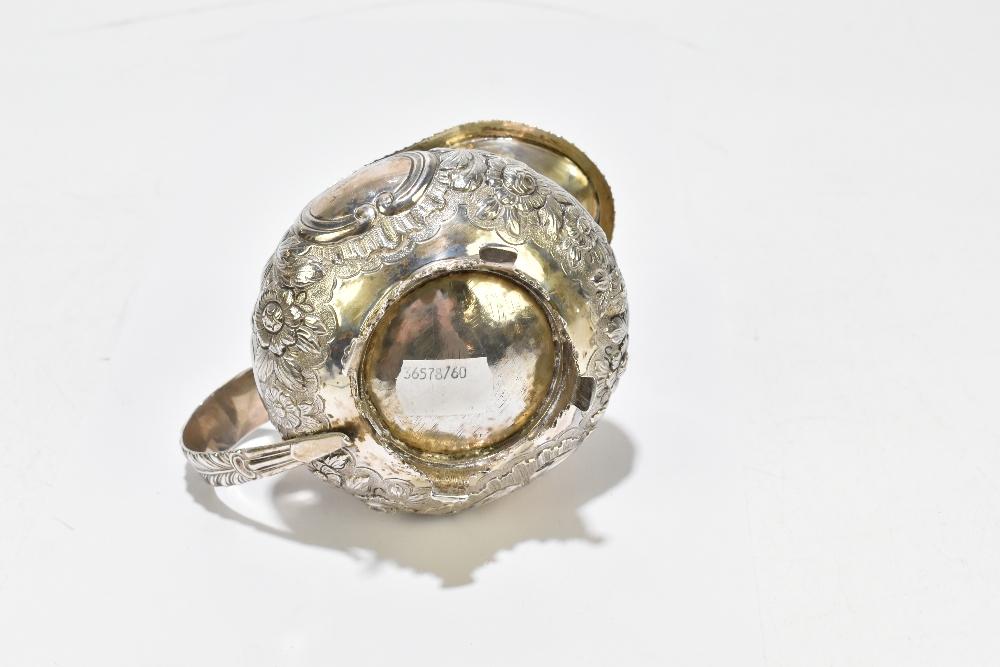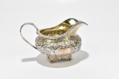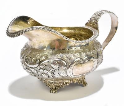 Lot 2398 of 2131: A George IV hallmarked silver floral embossed milk jug of compressed circular form with bead decorated rim and leaf decoration to the handle, London 1824, length 15.5cm, approx 7.4ozt/230g.