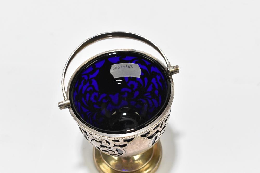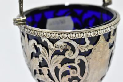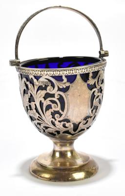 Lot 2401 of 2131: NATHAN & HAYES; an Edwardian hallmarked silver swing handled basket with blue glass liner and floral leaf decorated body above a circular foot, Chester 1902, height with handle down 11cm, silver weight approx 4.86ozt/151.3g.