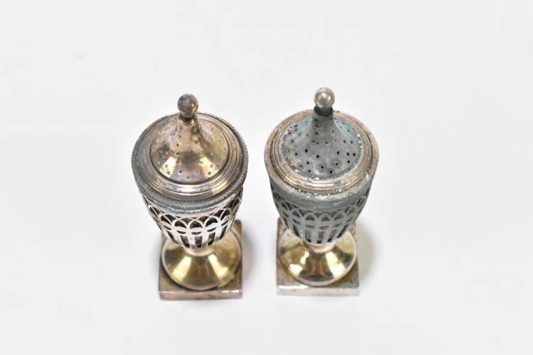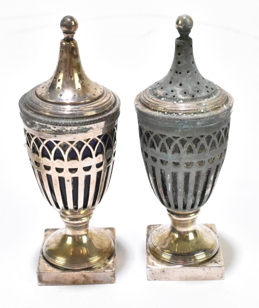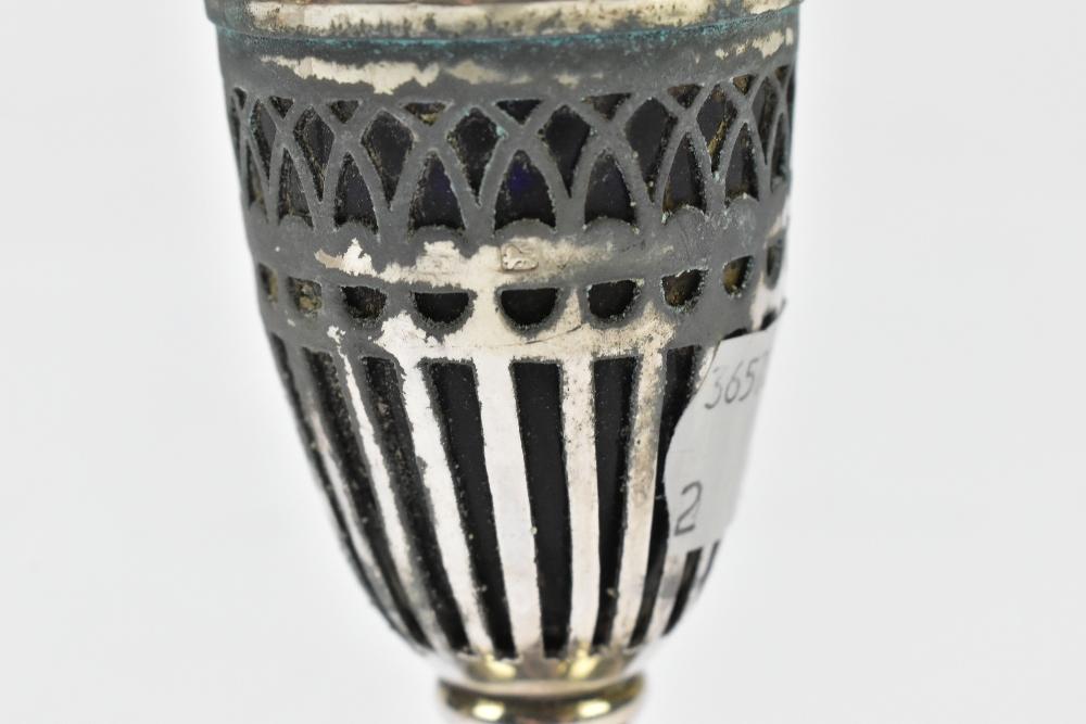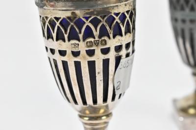 Lot 2402 of 2131: NATHAN & HAYES; a pair of hallmarked silver peppers with pierced bodies, blue glass liners and stepped square sectioned bases, Chester 1912, height 12.5cm (af).