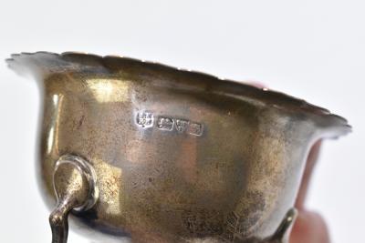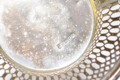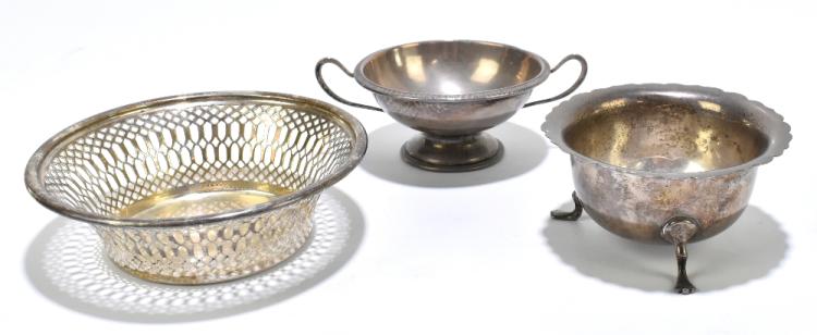 Lot 2408 of 2131: An Edwardian hallmarked pierced silver circular dish, Chester 1906, diameter 12cm, together with a hallmarked silver twin handled dish and a further silver dish, combined weight 5.1ozt/159g (3).