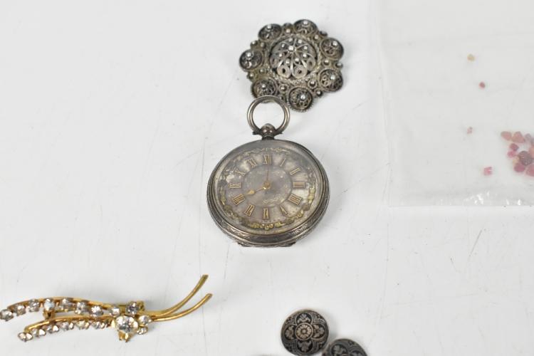 Lot 2428 of 2131: An Edwardian yellow metal and seed pearl circular brooch, with a further yellow metal bar brooch, pair of yellow metal earrings, also a yellow metal regard ring set with semi-precious stones, with assorted costume jewellery and a white metal fob watch stamped 800/1000, assorted loose rough cut stones, etc.