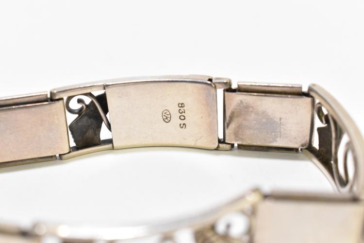 Lot 2497 of 2131: ***WITHDRAWN***A 1960s Scandinavian silver bracelet formed of four pierced scrolling panels interspaced by four rectangular block panels, stamped 830s with maker's mark VK, length 19.5cm, approx 35g.