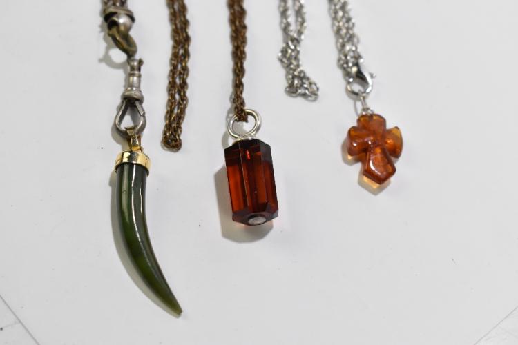 Lot 2540 of 2131: A white metal chain supporting an amber cross pendant, length 37cm, with a late Victorian lady's fob chain supporting a jade coloured pendant in the form of a tooth, and a further brass chain (3).