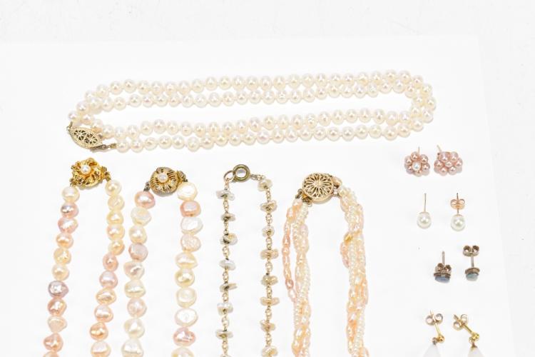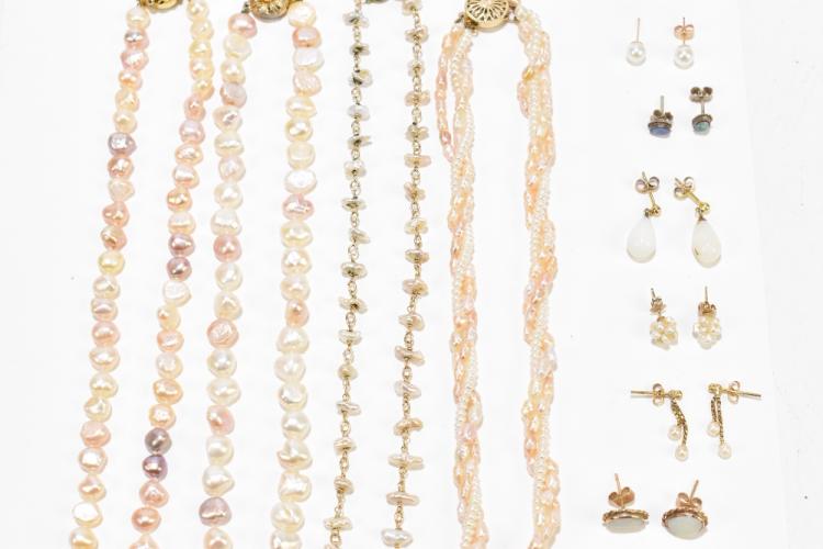 Lot 2550 of 2131: Five cultured pearl necklaces, two pairs of cultured pearl earrings, three pairs of cultured pearl ear studs, a pair of opal earrings and two pairs of opal ear studs, all with yellow metal mounts.