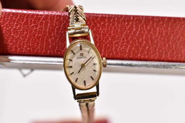 Lot 2565 of 2131: OMEGA; a 9ct yellow gold lady's vintage wristwatch with oval dial and gold bracelet, length approx 17.5cm, combined approx 18.5g, boxed and sold with some paperwork when purchased in 1970.