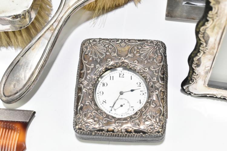 Lot 2589 of 2131: An Edwardian hallmarked silver mounted leather pocket watch case, with embossed foliate detailing, Birmingham 1909, height 19cm, enclosing a chrome pocket watch, a modern silver mounted photograph frame with two oval apertures, London 1986, a modern hallmarked silver mounted desk timepiece, a silver mounted photograph frame, marks worn, together with three hallmarked silver brushes and a comb (8).