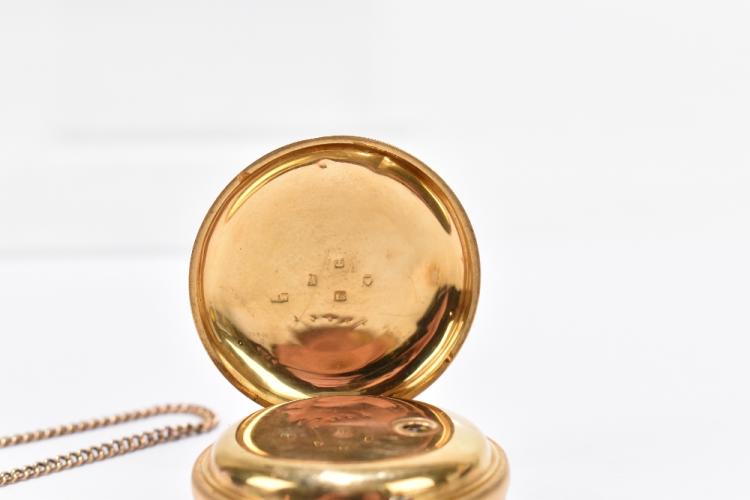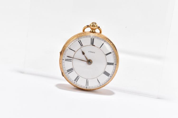 Lot 2604 of 2131: An 18ct yellow gold key wind open face fob watch, the circular enamelled dial set with Roman numerals, signed 13082 to the dial, diameter 37mm, approx. 63.5g, with a 9ct yellow gold Albert chain and T-bar, approx. 5g (2).