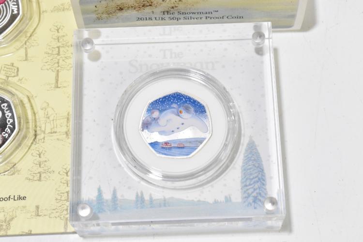 Lot 2635 of 2131: GREAT BRITAIN; a Royal Mint presentation 50p 'The Snowman', slabbed, with box and paperwork, with a limited edition set of eight 50p pieces from Disney's Winnie the Pooh.
