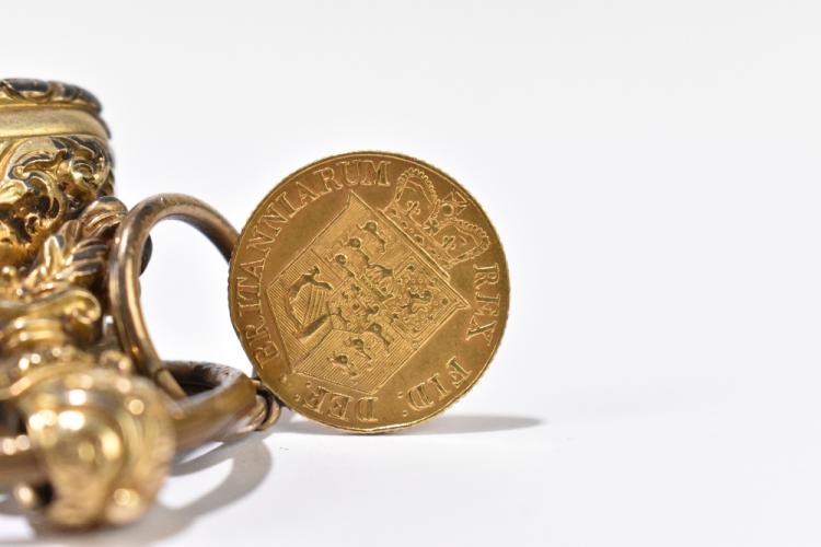 Lot 2644 of 2131: A George III half sovereign,1818, suspended on a loop attachment and sold with two large Georgian base metal fob seals one with ribbon attachment.