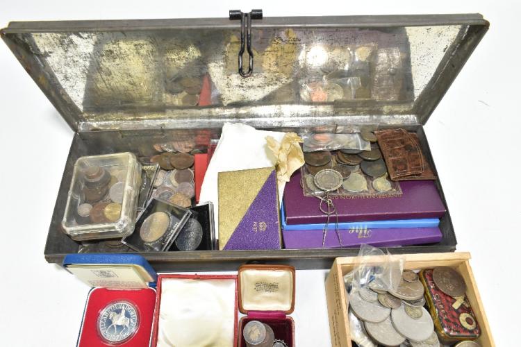 Lot 2646 of 2131: A large quantity of coins including a George III crown, a Victoria crown and Victoria half crowns, various more modern commemorative crowns, presentation pack, a small group of 18th and early 19th century tokens including a Macclesfield half penny, a boxed Jubilee Queen Victoria medallion, etc.