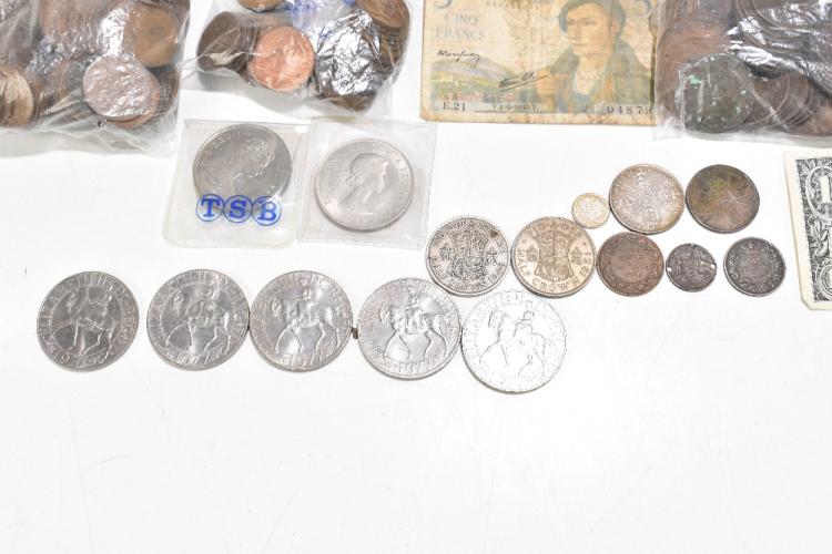 Lot 2650 of 2131: A quantity of assorted British and foreign coins, including 1p pieces, a 5 franc note, etc.