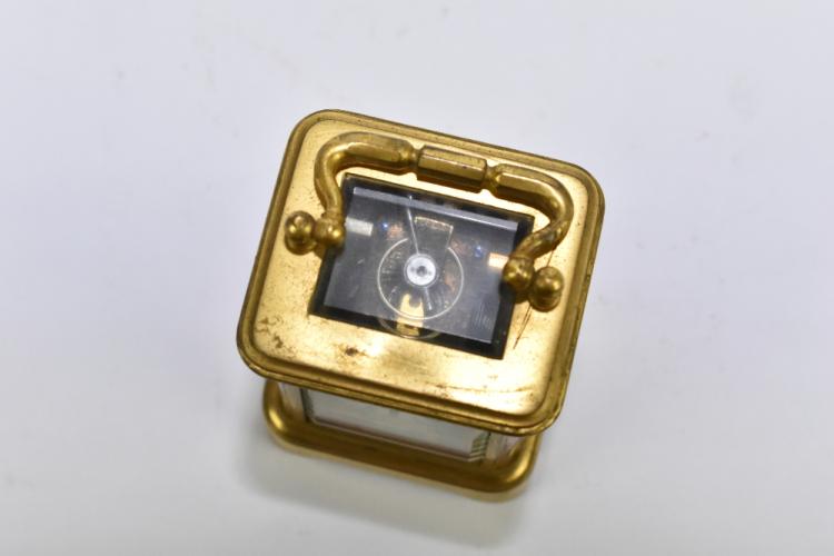 Lot 2670 of 2131: A 19th century French miniature lacquered brass and porcelain carriage clock, the hand painted circular dial set with Roman numerals, with three further hand painted panels depicting landscape scenes, height including swing handle 9.5cm.