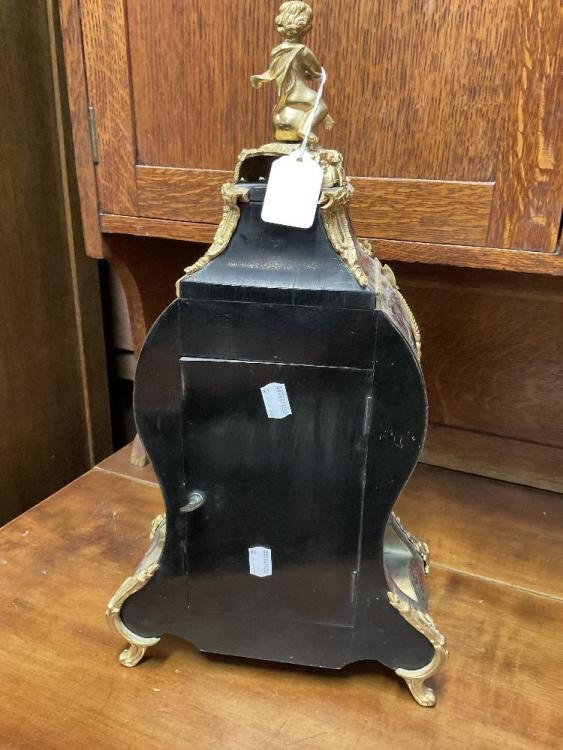 Lot 2677 of 2131: A French tortoiseshell and brass inlaid bracket clock with cherub finial above circular dial set with Roman numerals to the white enamel plaques and with movement signed 'Rollin A. Paris 2564', height 50cm, sold with pendulum and key.
