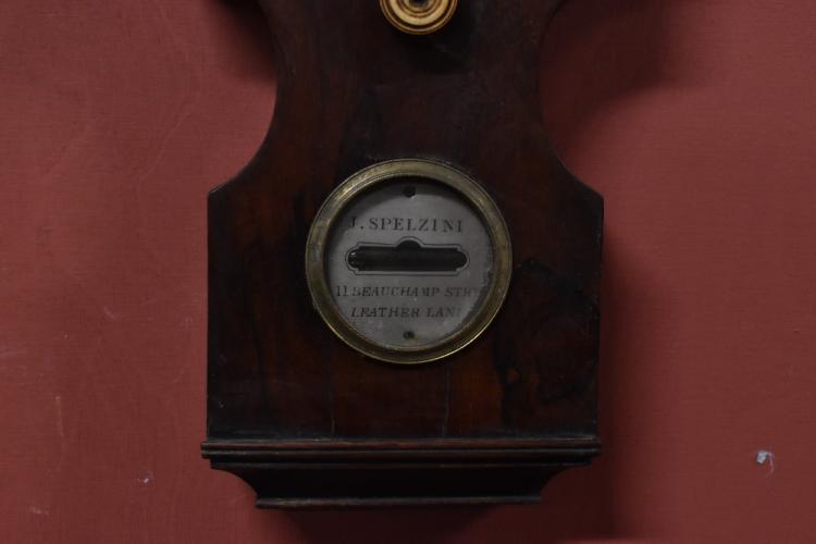 Lot 2694 of 2131: An early 19th century rosewood mercury barometer, with silvered dial thermometer and dry/damp dial, all above a spirit level dial engraved 'J. Spelzini, 11 Beauchamp Street, Leather Lane', height 101cm.