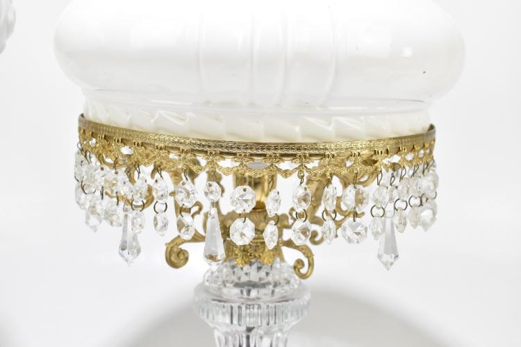 Lot 2696 of 2131: A late 19th century French painted glass oil lamp, with moulded glass shade, height 53cm, together with a gilt metal and cut glass table lamp with moulded opaque shade and hung with lustre drops, 48cm (2).