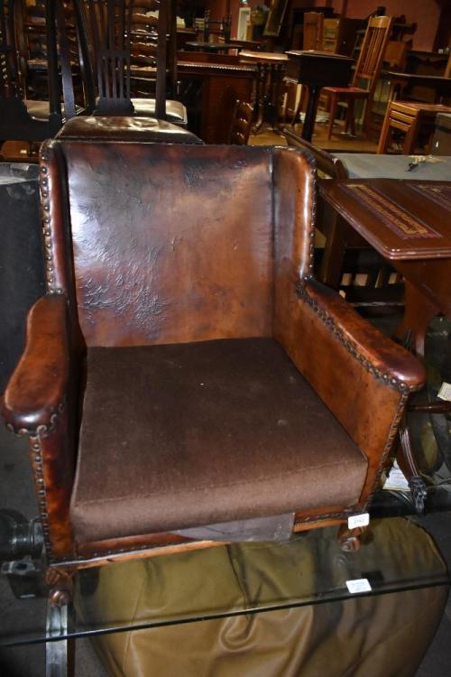Lot 2742 of 2131: An early 20th century child's wing back armchair with leatherette material and studded edge, raised on walnut cabriole feet, height 60cm, depth 50cm.