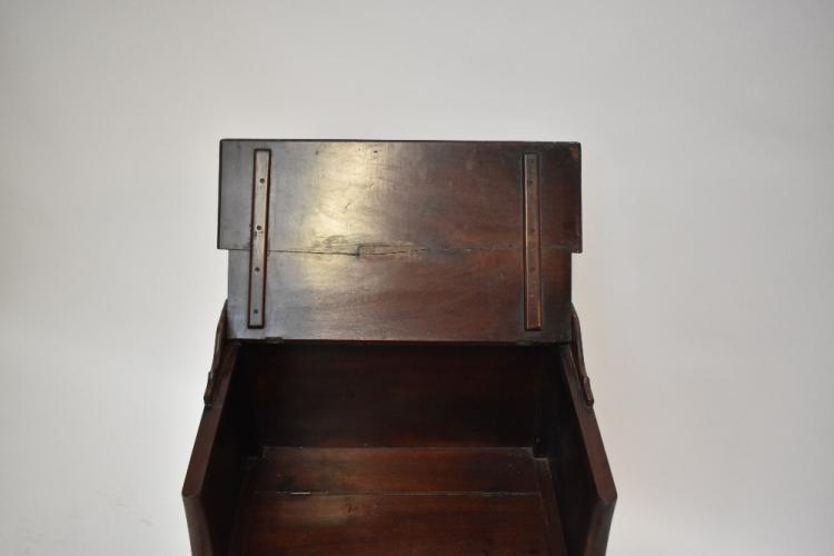 Lot 2745 of 2131: A late George III mahogany night cupboard, the raised back with hinged lid above box seat, raised on square sectioned legs, width 55cm.