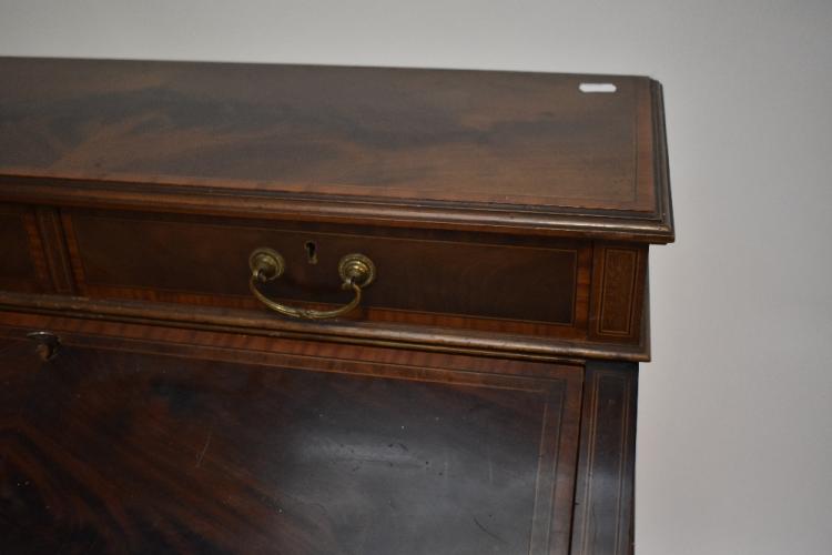 Lot 2747 of 2131: An Edwardian mahogany and satinwood crossbanded cylinder desk, the upper section with two short drawers above a hinged fall enclosing three further drawers with a single frieze drawer stamped 'Maple & Co', raised on square sectioned tapering legs united by a stretcher, width 77cm.