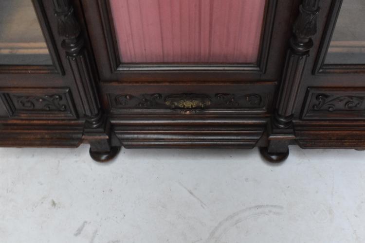 Lot 2754 of 2131: A 19th century French oak display cabinet, the carved cornice decorated with a male and female mask, above a central glazed door flanked by two fixed glazed panels, with two fluted and turned column supports on plinth base and bun feet, height 159cm, width 132cm, depth 52cm.
