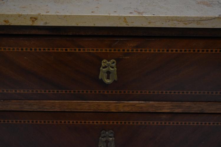 Lot 2755 of 2131: A French Louis XVI style inlaid walnut commode, with veined marble top above three long drawers on cabriole legs, height 86cm, width 103cm, depth 47cm.