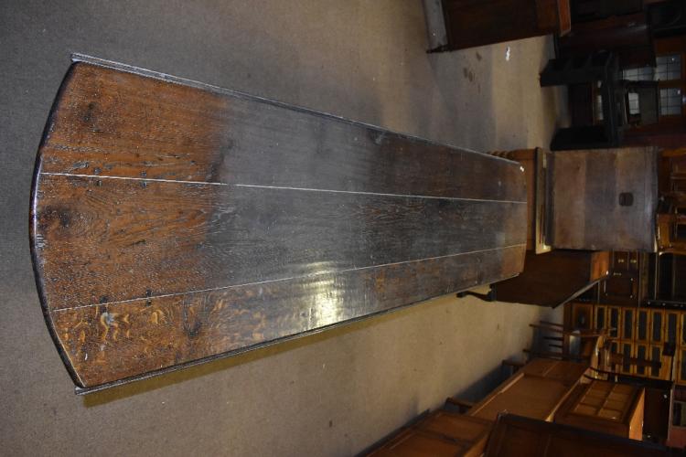 Lot 2818 of 2131: A large oak wake table in the George II style, the plank top with oval flaps raised on turned tapering legs to compressed pad feet, length 274cm, width of top without flaps up 61cm and each flap approx 81cm.