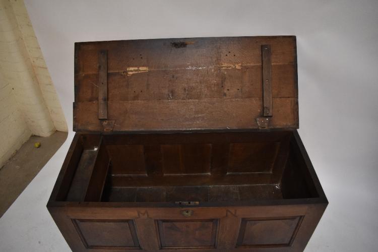 Lot 2830 of 2131: An 18th century oak blanket box, the hinged lid above frieze inlaid with the initials MN with triple panelled front, twin drawers and raised on block supports, width 129cm.