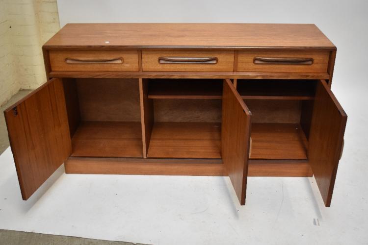 Lot 2847 of 2131: G-PLAN; a mid-century teak sideboard, with three drawers above three panelled cupboard doors, raised on a plinth base, width 142cm, depth 44cm, height 75cm.