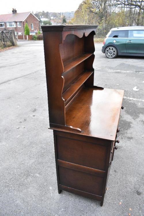 Lot 2890 of 2131: A mid 20th century oak dresser plate rack back, the back with two fixed shelves, the base section with two drawers above two panelled doors, raised on block feet, width 100cm, depth 50cm, height 152cm.