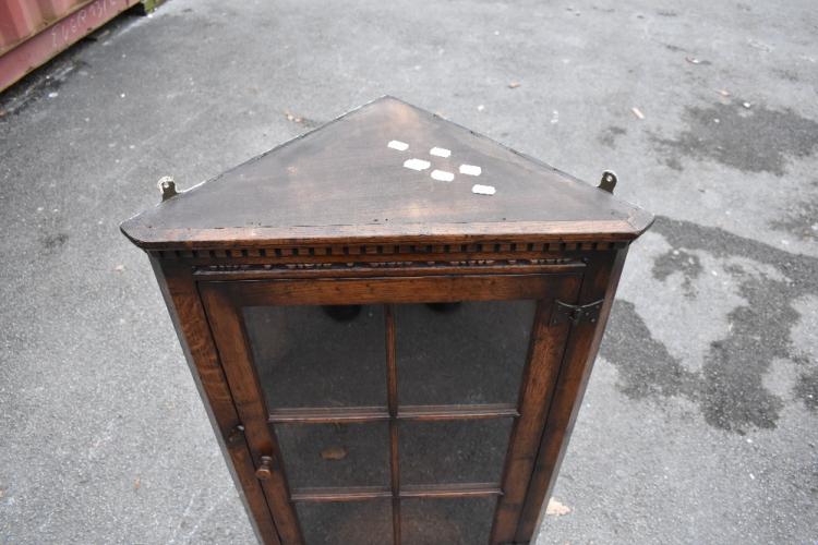 Lot 2892 of 2131: A reproduction carved oak hanging corner cabinet with single glazed door, height 95cm, width 60cm, depth 32.5cm.
