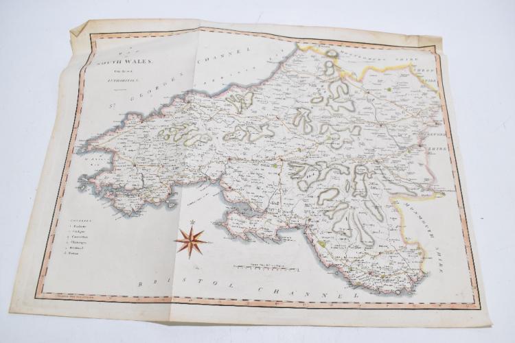 Lot 2163A of 2131: THOMAS KITCHIN; a hand coloured engraved map of Cheshire, 16cm x 23.5cm, with a Kitchin linen backed map of Carnarvonshire, a John Cary map of South Wales, 42.5cm x 55, a Saxton-Kip map of Denbigh, a Senex road map and various other Cheshire maps, etc (quantity).