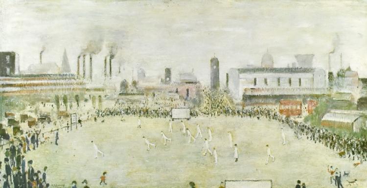 Lot 2000A of 2131: AFTER LAURENCE STEPHEN LOWRY (1887-1976); limited edition print, ‘The Cricket Match’, with blind stamp and numbered 602/850, 35cm x 66cm, framed and glazed.
