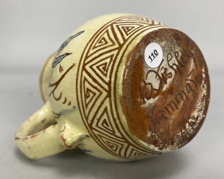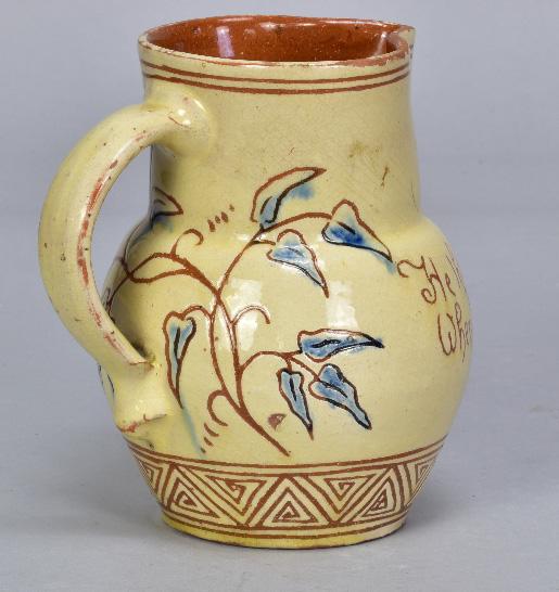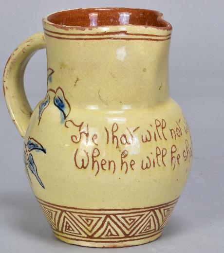 Lot 2 of 493: EDWIN BEER FISHLEY (1832-1912) for Fremington Pottery; a small slipware jug covered in pale yellow glaze incised with the traditional verse 'He that will not when he may/When he will he shall have nay', incised signature and pottery mark, height 13cm.