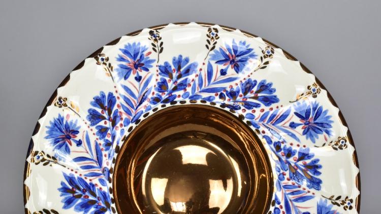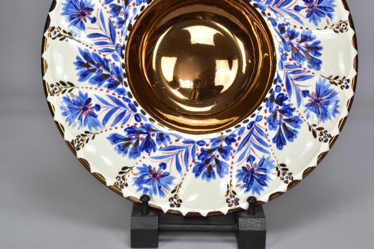 Lot 8 of 493: GORDON FORSYTH (1879-1952); a white earthenware charger, copper lustre on cobalt underglaze, painted mark, diameter 36cm. (D)