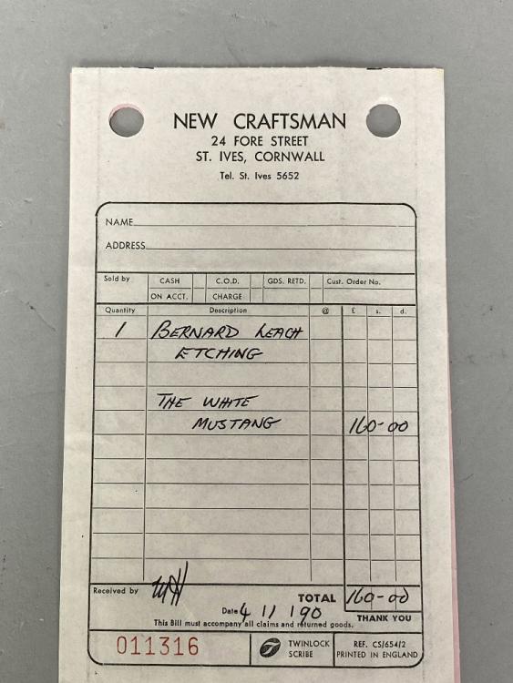 Lot 18 of 493: BERNARD LEACH (1887-1979); 'The White Mustang', a soft ground etching, 1918, Leach-Redgrave edition posthumously printed from steel plate, 'Bernard Leach 1918' etched into plate, numbered in pencil 4/25, 16.4 x 23.1cm, unframed. Literature: 'The Etchings of Bernard Leach' by Simon Olding (Crafts Study Centre, Farnham, 2010, no. 62).  Provenance: Purchased from New Craftsman Gallery, St Ives, 1990, and sold with original receipt.