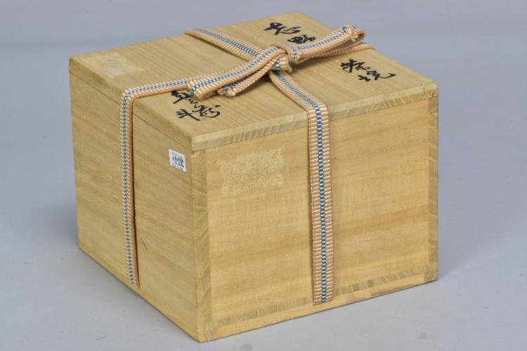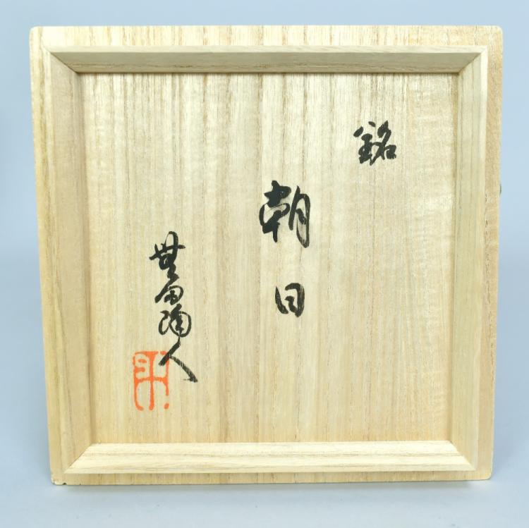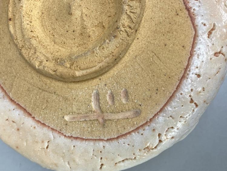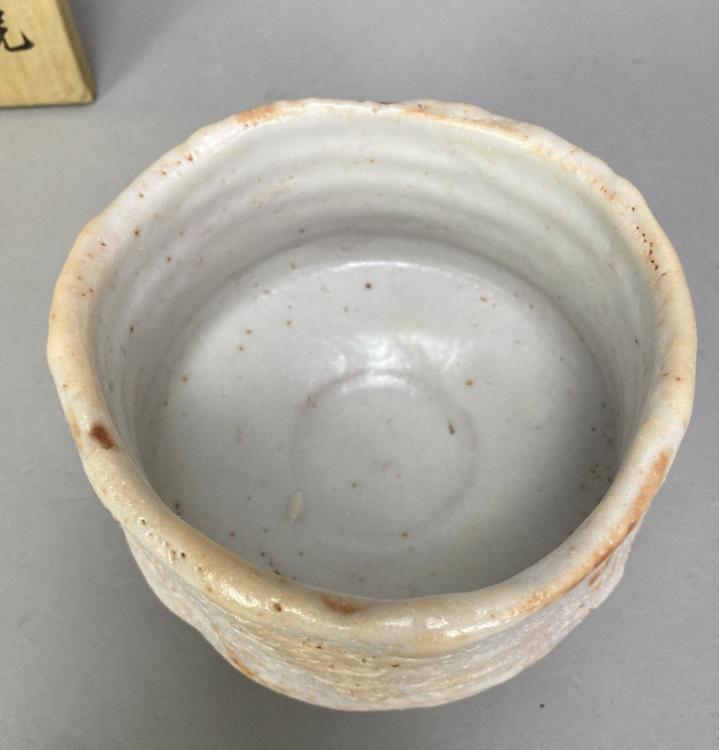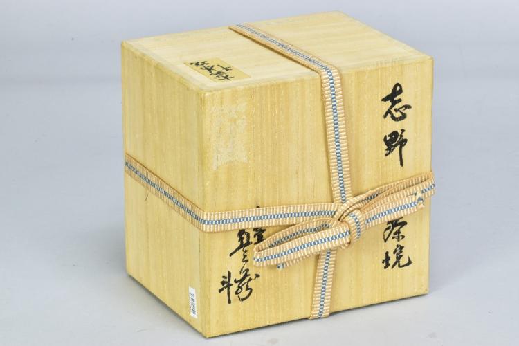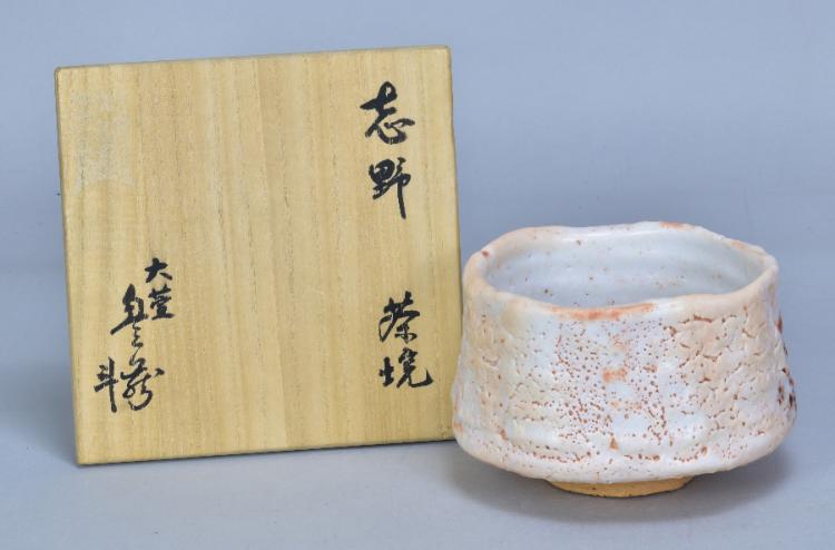 Lot 24 of 493: TOYOZO ARAKAWA (1894-1985); a stoneware chawan covered in pitted shino glaze, incised mark, diameter 14cm, with signed box, Shifuku and four matching pillows. Toyozo Arakawa rediscovered the techniques of manufacturing shino glazes first perfected during the Momoyama and Edo periods. He also proved that these legendary ceramics originated in his native Mino province (not Seto as previously believed), and was responsible for the revival of the Mino kilns. He lived and worked in Mino, near Nagoy