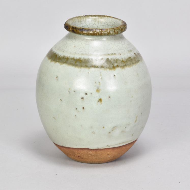 Lot 25 of 493: KATHARINE PLEYDELL-BOUVERIE (1895-1985) for Cole Pottery; a bulbous stoneware vase covered in grey glaze decorated with a simple motif and band, impressed KPB and pottery marks, painted code marks, made 1925-46, height 21cm. Provenance: The Nancy & Andrew Ramage collection; purchased from the Peter Highley collection.