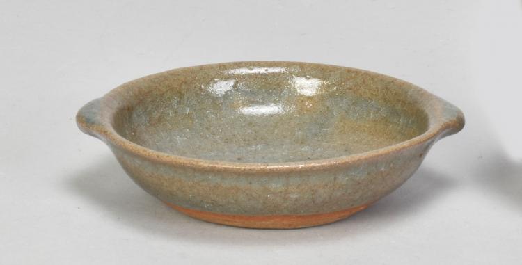 Lot 26 of 493: KATHARINE PLEYDELL-BOUVERIE (1895-1985); a lugged stoneware dish partially covered in grey/green glaze, impressed KPB mark, diameter 14.5cm (including handles). (D) Provenance: The Nancy & Andrew Ramage collection; purchased from the Peter Highley collection.