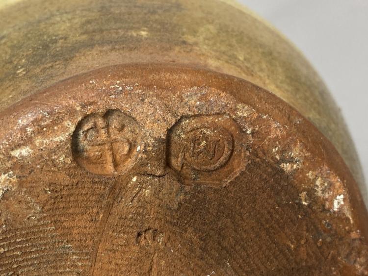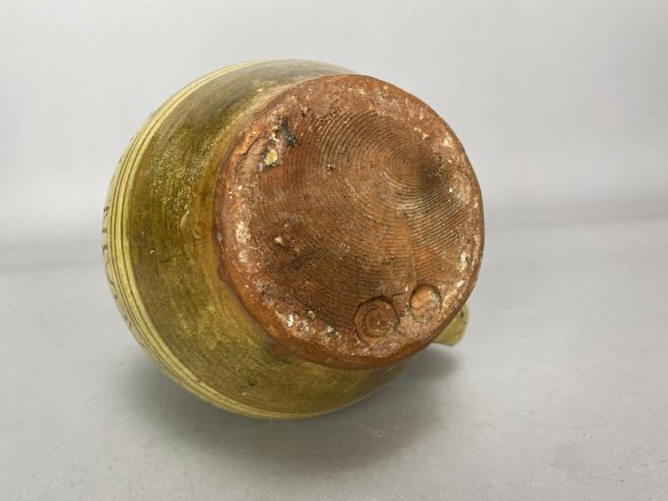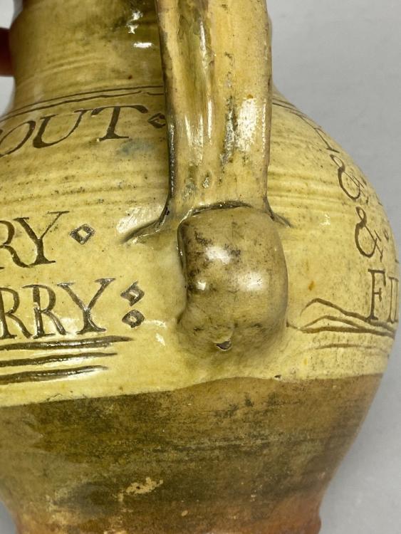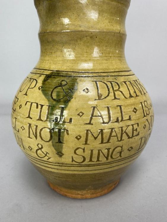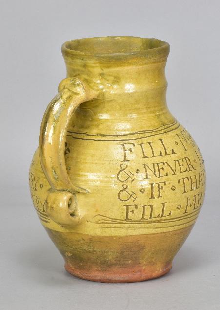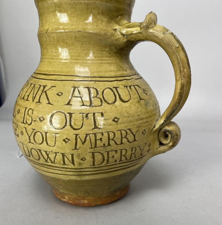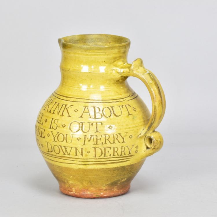 Lot 31 of 493: MICHAEL CARDEW (1901-1983) for Leach Pottery; a slipware calligraphic jug with scroll handle covered in pale yellow glaze, incised seriffed lettering 'Fill me up & drink about & never leave till all is out & if that will not make you merry fill me again & sing down derry', impressed MC and pottery marks, made 1923-26, height 21.5cm. (D) Provenance: The Nancy & Andrew Ramage collection; purchased from Long Room Gallery, Winchcombe.