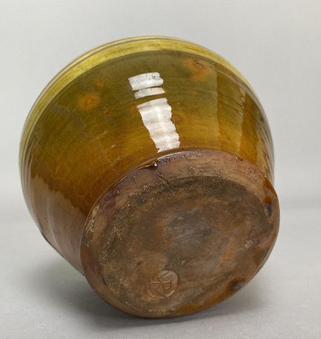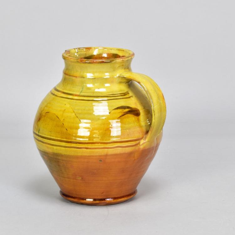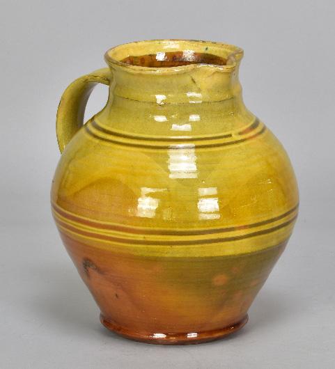 Lot 43 of 493: Attributed to MICHAEL CARDEW (1901-1983) for Winchcombe Pottery; a slipware jug with faint iron meander decoration on yellow ground, impressed pottery mark, height 20cm. (D) Provenance: The Nancy & Andrew Ramage collection.