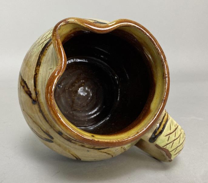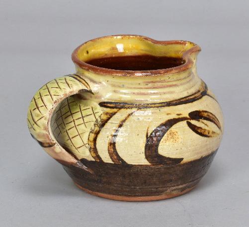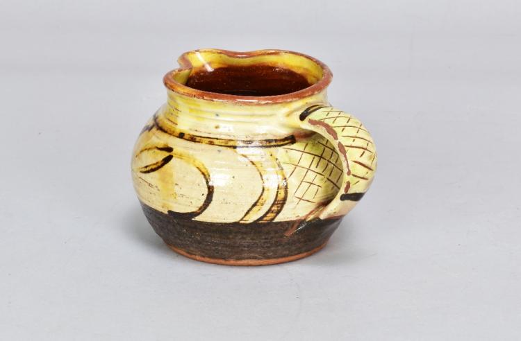 Lot 55 of 493: RAY FINCH (1914-2012) for Winchcombe Pottery; a small slipware milk jug, iron decoration on yellow ground, impressed early RF and pottery marks, made 1936-42, height 9cm. (D) Provenance: The Nancy & Andrew Ramage collection; purchased from the Peter Highley collection, 2015.