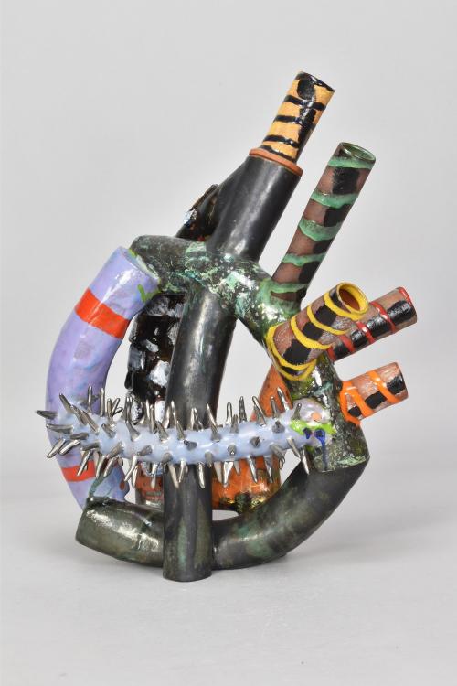 Lot 248 of 493: ANGUS SUTTIE (1946-1993); an earthenware sculptural vessel with stopper in the abstract form of a teapot, richly decorated with bright coloured glazes and enamels, height 38.5cm. (D)Note: Although not signed, this is not unusual for Suttie's work made in the late 1970s around the time of his degree show at Camberwell. Our thanks to Henry Pim for this information.Provenance: Purchased from a gallery in Bristol in the 1980s.