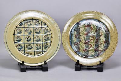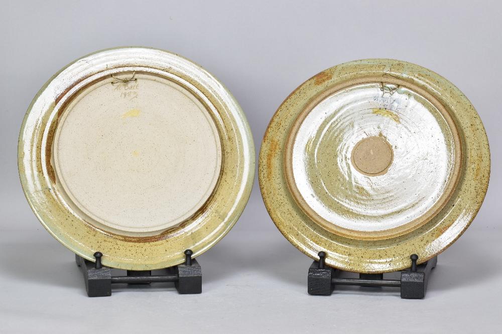 Lot 440 of 493: ALAN BALL; two stoneware plates with floral decoration, painted and incised signatures and dated 1983 and 1984, largest diameter 32cm (2). (D) Provenance: Purchased from Arts Centre Washington.
