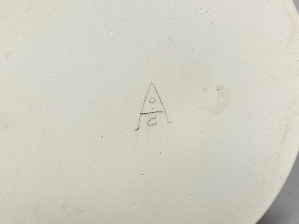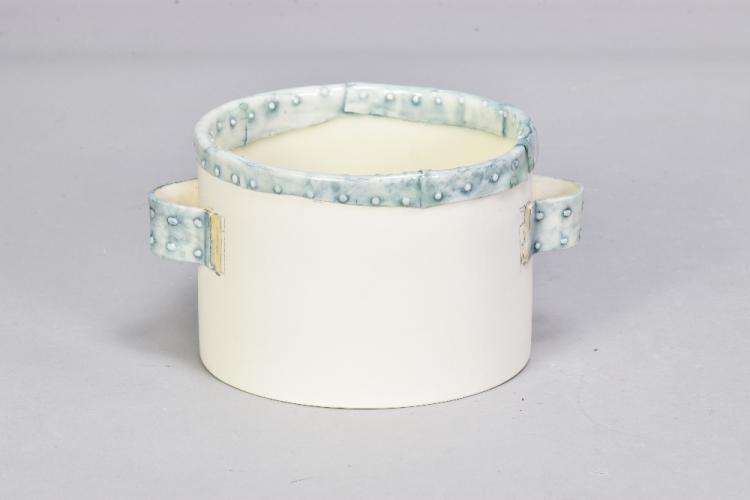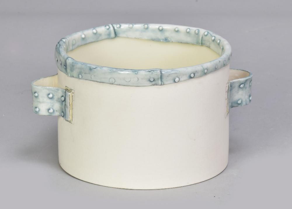 Lot 441 of 493: ALISON OGDEN; a cylindrical porcelain twin handled pot with relief decoration, painted AO mark, height 8.5cm. (D)