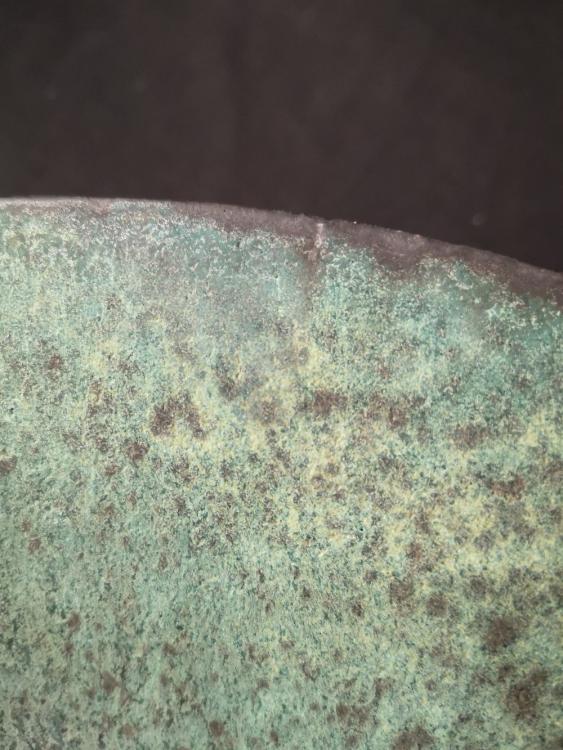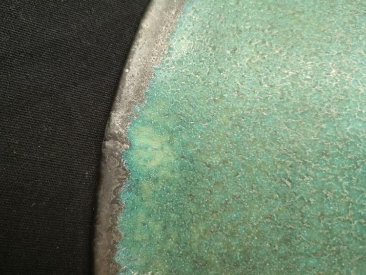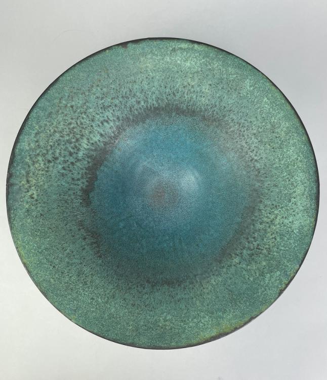 Lot 4 of 723: ABDO NAGI (1941-2001); a large stoneware pedestal bowl covered in mottled turquoise/green glaze with bronze rim, painted mark, made 1990, diameter 40.5cm. (D)