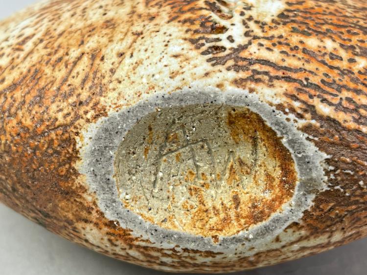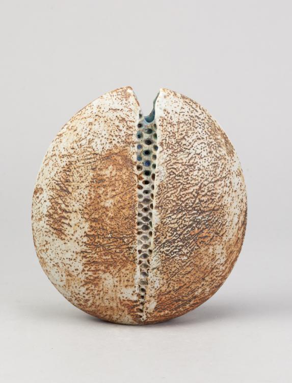Lot 29 of 723: ALAN WALLWORK (1931- 2019); a stoneware split pebble with impressed decoration forming the parting partially picked out in turquoise glaze, incised AW mark, height 18cm. (D)