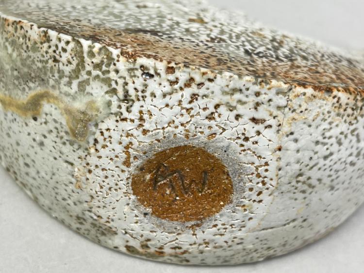 Lot 32 of 723: ALAN WALLWORK (1931- 2019); a stoneware wedge with impressed decoration partially picked out in green glaze, incised AW mark, height 10.5cm. (D)