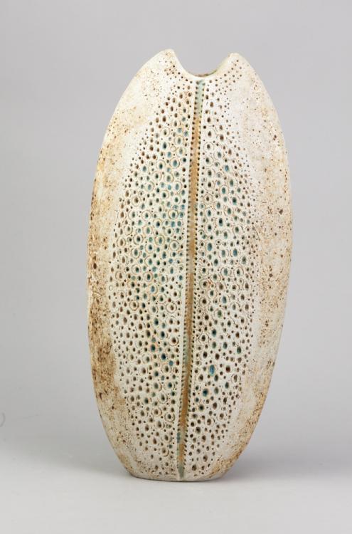 Lot 33 of 723: ALAN WALLWORK (1931- 2019); a very tall stoneware pebble with impressed decoration picked out in turquoise glaze and an incised parting picked out in gold lustre, incised AW mark, gallery label, height 46cm. (D) Provenance: Purchased from The Gallery Upstairs, Henley-in-Arden.