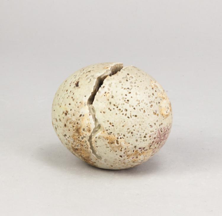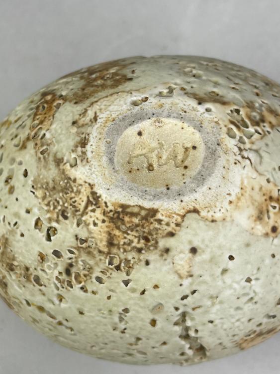 Lot 37 of 723: ALAN WALLWORK (1931-2019); a stoneware split egg partially covered in pale green glaze with lilac blushes, incised AW mark, height 9cm. (D)