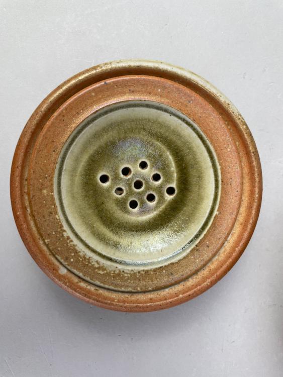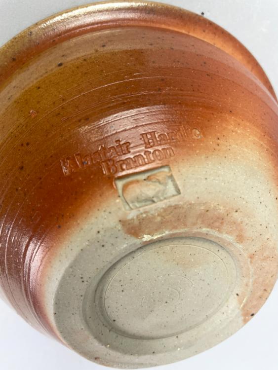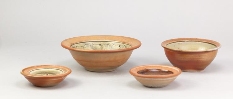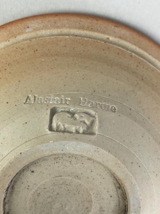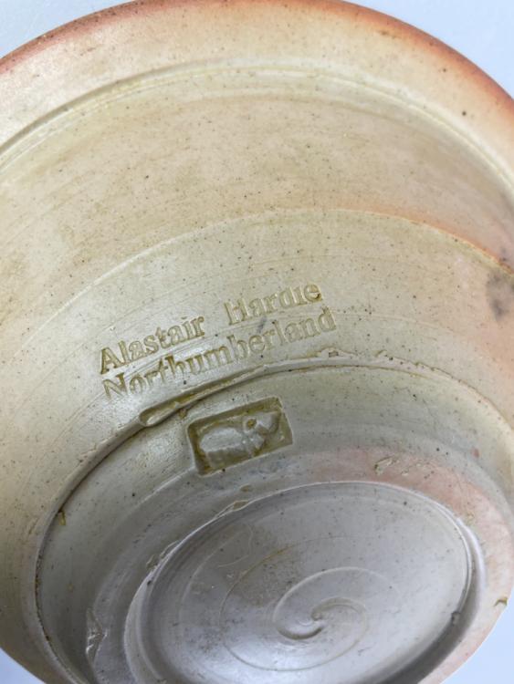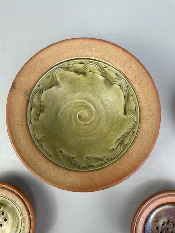 Lot 39 of 723: ALASTAIR HARDIE (born 1941); a wood fired stoneware bowl, green ash glaze to the well with incised fish and wave decoration, impressed marks, diameter 21cm, a smaller bowl and two strainers (4). (D)